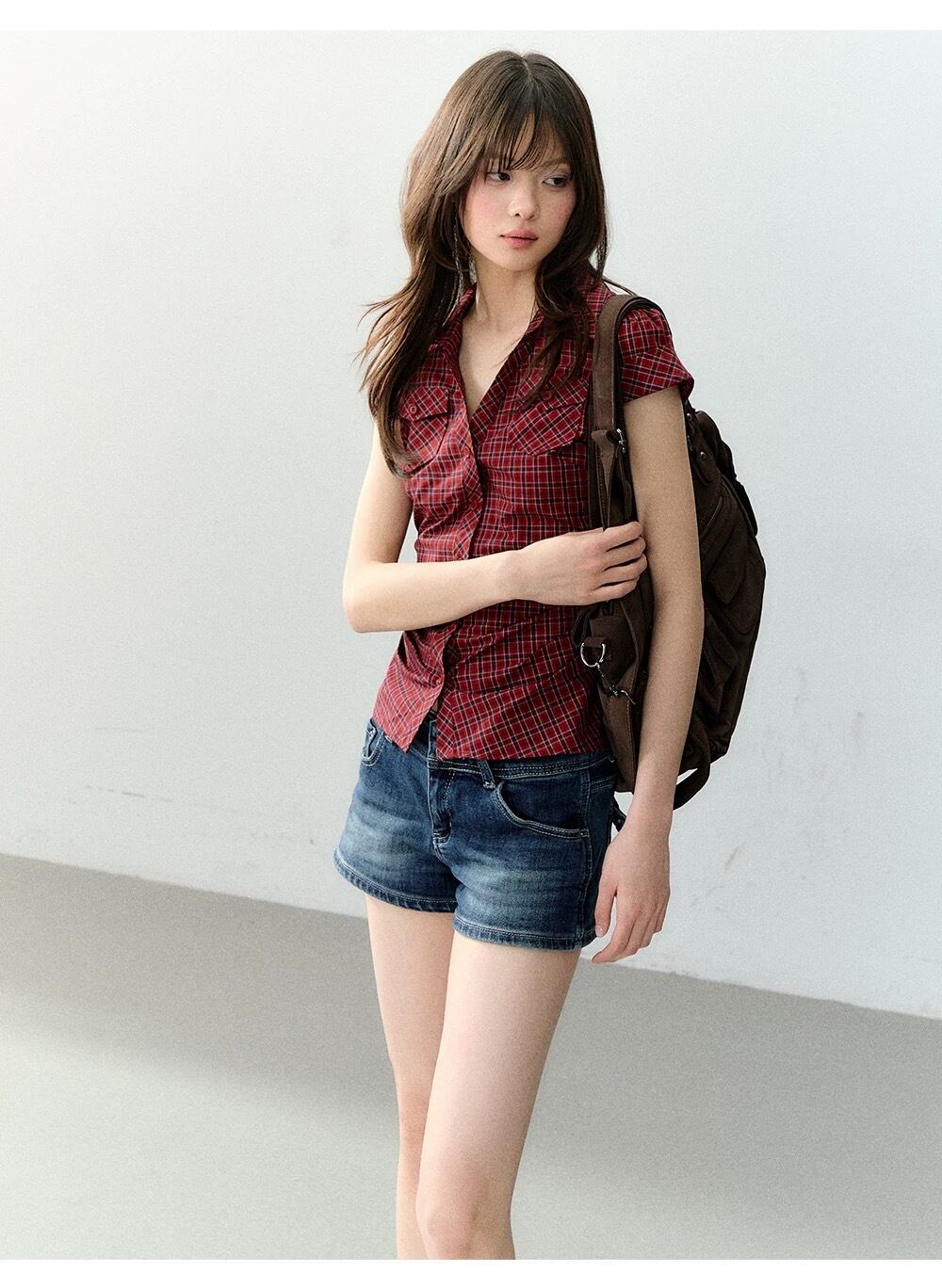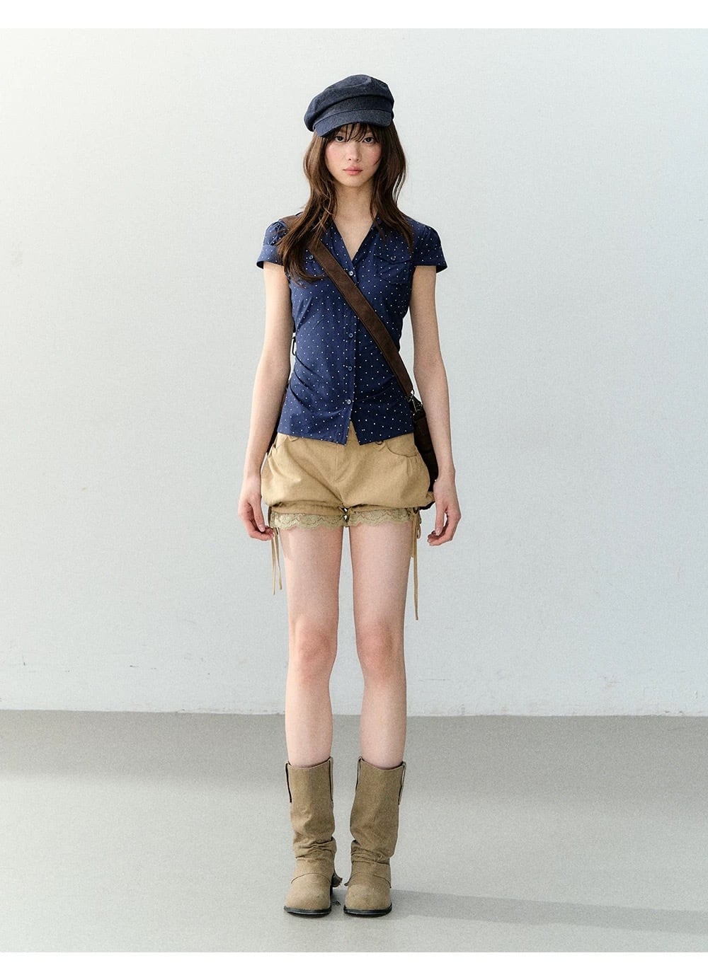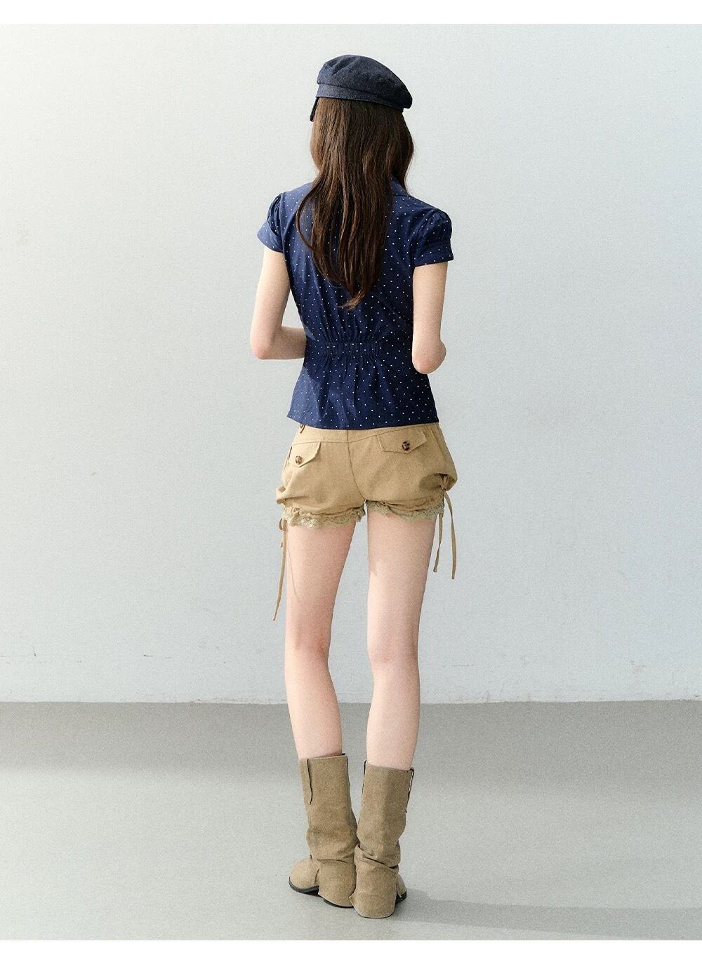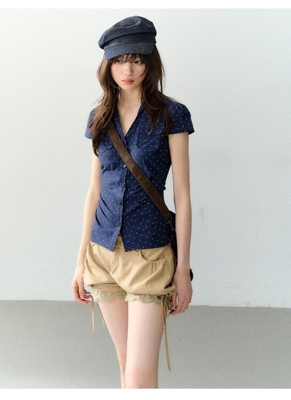 【Shirt】-クラシック 半袖シャツブラウス-全2色 ネイビー レッド 春夏新作 大人可愛い 韓国風 着回し トップス