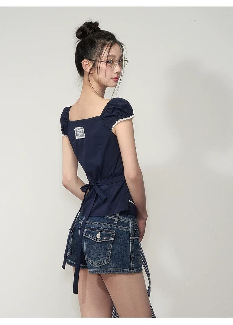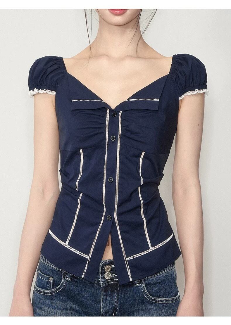 【Shirt】-春限定パフスリーブ ドロストシャツ-全2色 春夏新作トレンド 韓国風 きれいめ 着回し ホワイト ネイビー トップス